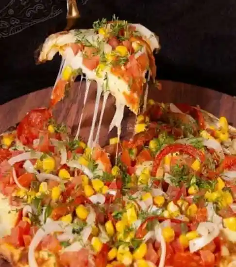 Mozzarella, pepperoni americano, pimentones encurtidos, jalapeño, maíz dulce, cebolla blanca, tomate chonto y cilantro. 8 porciones 35cm