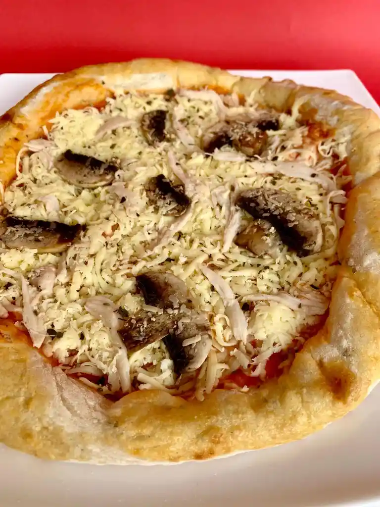 Pizza empacada al vacio de 25cms con Masa Madre, Salsa Pomodoro, Pollo, champiñones, oregano y Queso Mozarella.