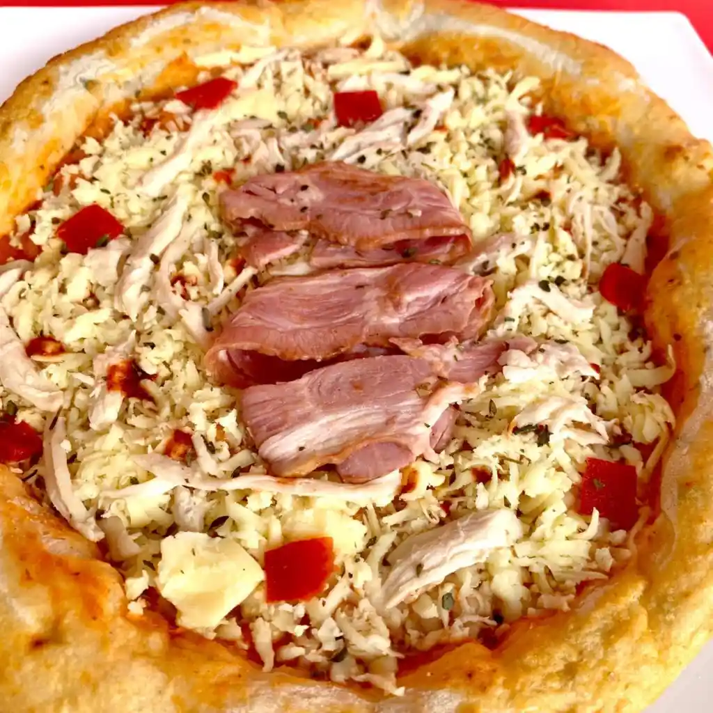 Pizza empacada al vacio de 35 cms con Masa Madre, salsa pomodoro, pollo a la parrilla, tocineta, pimentón ahumado, oregano, queso mozarella y sriracha