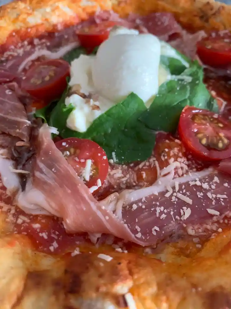 Pizza empacada al vacio de 25cs con masa Madre, pomodoro italiano, prosciutto , mozzarella fior di latte, aceite balsamico, tomate cherry y albahaca.