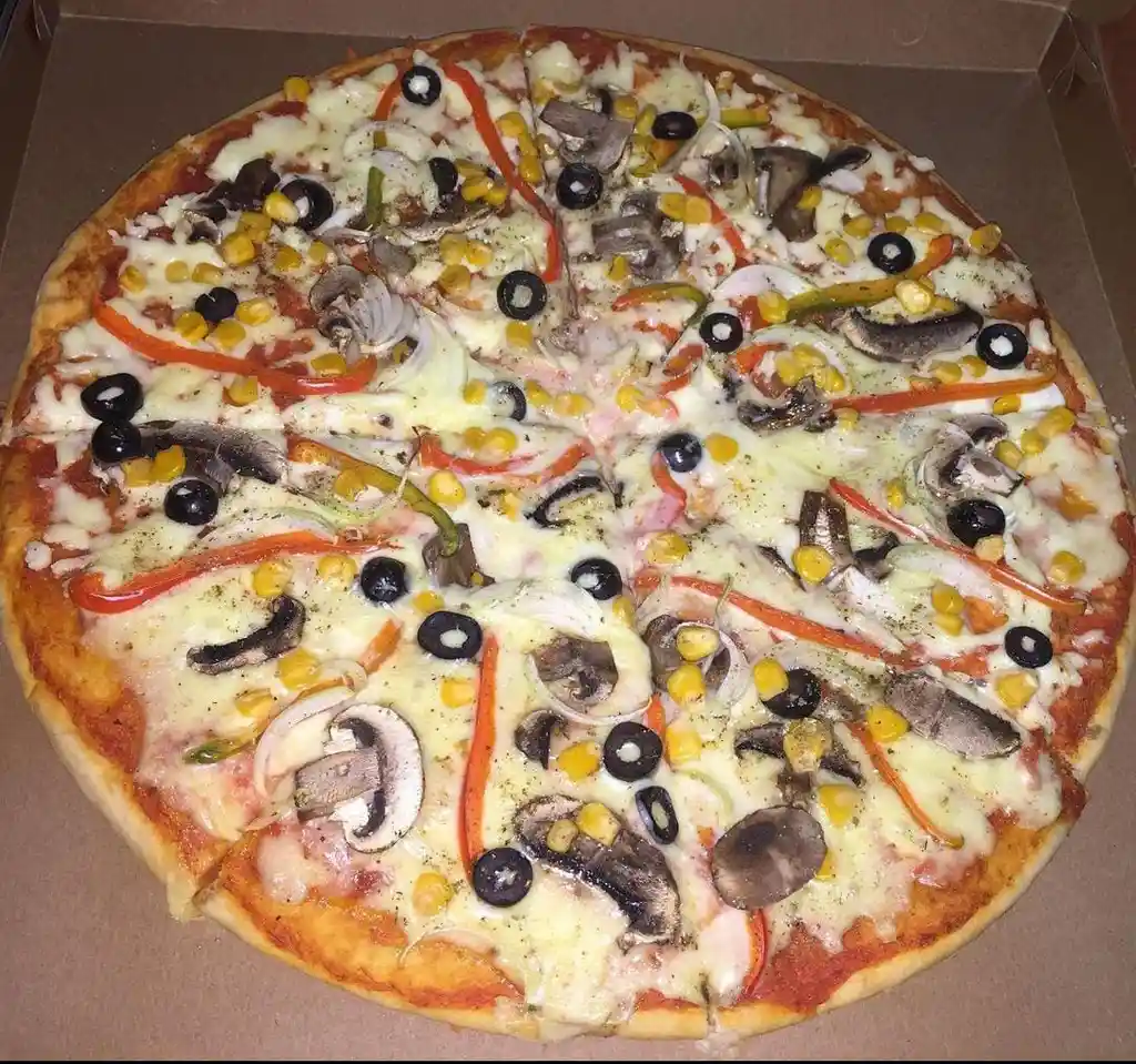 Pizza Vegetariana de 40 cm salsa de la casa, queso mozzarella, cebolla, pimentón, aceitunas, maíz, champiñones y orégano