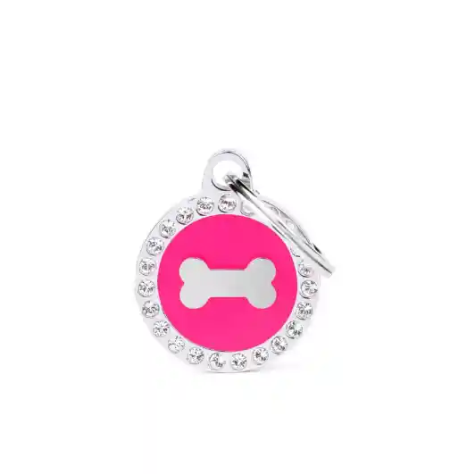 Esta es una placa de identificación de lujo para mascotas, que combina seguridad con un diseño sofisticado. Presenta una forma circular con un llamativo fondo en color fucsia vibrante y un detalle central de un huesito en relieve plateado. Lo que hace destacar a esta pieza es su borde decorado con cristales incrustados, que aportan un brillo excepcional y elegancia. Está fabricada con materiales de alta calidad y un acabado pulido, garantizando durabilidad frente al uso diario. Incluye su argolla metálica para un ajuste firme al collar, siendo la opción ideal para quienes buscan un accesorio con estilo "glam" para su perro o gato.