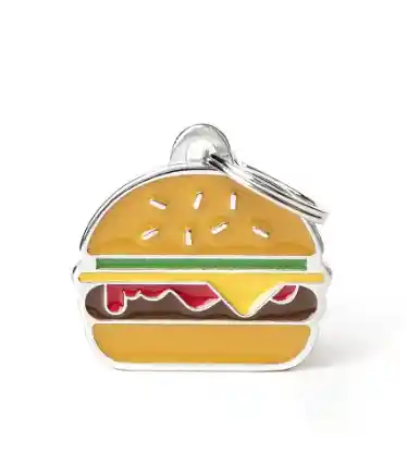 Esta es una placa de identificación creativa con un diseño detallado de hamburguesa. Está fabricada con un acabado esmaltado de alta calidad y un borde metálico resistente que garantiza durabilidad. Es un accesorio original, divertido y ligero, ideal para darle un toque de personalidad único al collar de tu perro o gato mientras se mantiene bien identificado.