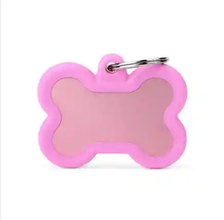 Esta es una placa de identificación premium para mascotas con un elegante diseño en forma de hueso. Se destaca por su acabado en color rosa suave y un marco exterior reforzado que protege la pieza central de metal. La superficie central es de aluminio anodizado con un efecto mate, ideal para realizar grabados personalizados claros y duraderos. Incluye una anilla de metal resistente para sujetarla de forma segura al collar, garantizando que tu mascota siempre porte su información de contacto con estilo y calidad.