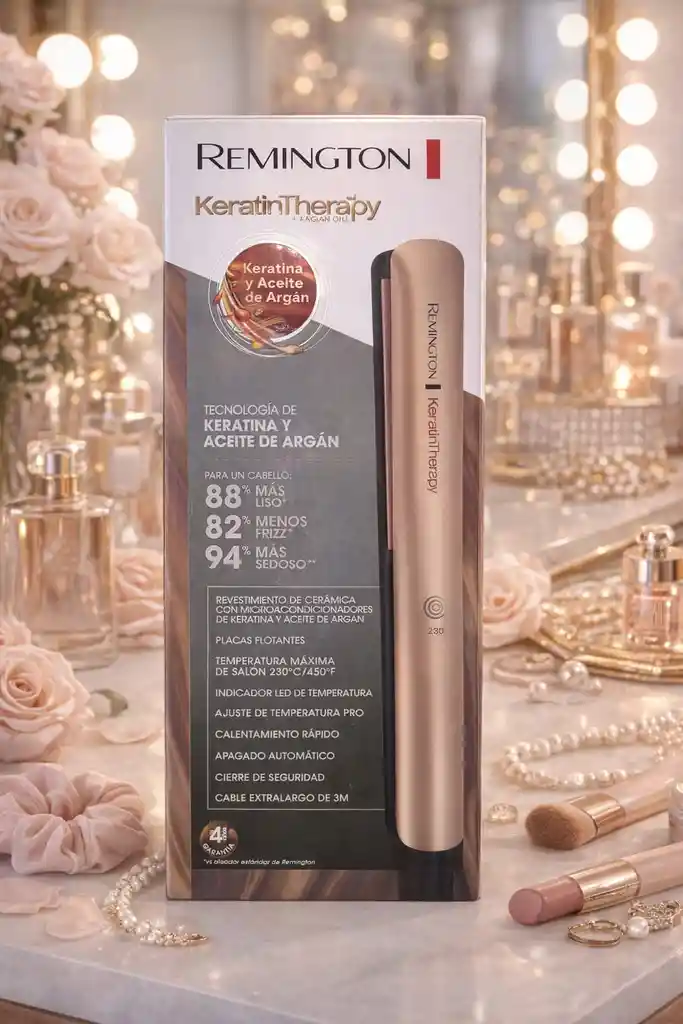 La plancha alisadora Remington Keratin Therapy incorpora tecnología de queratina y aceite de argán, diseñada para proteger el cabello mientras lo alisa, ayudando a que luzca más suave, brillante y saludable. Cuenta con placas de cerámica avanzadas con microacondicionadores, que se liberan durante el uso para reducir el daño y mejorar la apariencia del cabello. Ofrece un alto rendimiento gracias a su temperatura máxima de 230 °C (450 °F), lo que permite un alisado rápido y efectivo incluso en cabellos gruesos o difíciles. Además, tiene calentamiento rápido, lista en pocos segundos. Incluye placas flotantes, que se adaptan al mechón de cabello para un deslizamiento suave y uniforme, evitando tirones y mejorando los resultados. Dispone de control de temperatura ajustable e indicador LED, lo que permite adaptar el calor según el tipo de cabello para mayor cuidado y precisión. Entre sus beneficios visibles, proporciona hasta: 88% más liso 82% menos frizz 94% más sedosidad También está diseñada para mayor comodidad y seguridad, con: Cable extralargo de 3 metros Calentamiento rápido Apagado automático Cierre de seguridad En conjunto, es una herramienta de alta calidad y eficiencia, ideal para lograr resultados profesionales desde casa, cuidando el cabello mientras lo estiliza.