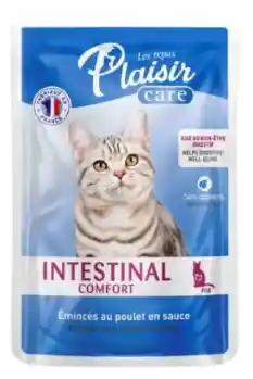 Plaisir Care Intestinal Comfort" para gatos está diseñado para favorecer la salud intestinal de los felinos. Contiene ingredientes que ayudan a proteger la pared intestinal y promueven el crecimiento de bacterias beneficiosas, contribuyendo al bienestar digestivo. Además, algunas variedades, como las que incluyen fibra y aceite de salmón, están formuladas para ayudar a controlar las bolas de pelo.