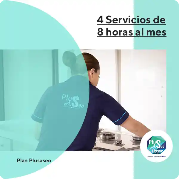 4 Servicios de 7.30 am y 4.30 pm De lunes a sabado. Incluye una hora de almuerzo *INCLUYE SERVICIOS*Aseo general - Lavado y planchado de ropa (max 2 horas diarias) - Limpieza de cocina - Limpieza profunda de baños. /Operarias contratadas formalmente con prestaciones y seguridad social. / Operarias con su debida dotación / Servicio al cliente, respaldo y garantía por parte de Plusaseo SAS / Operarias son seleccionadas bajo un riguroso proceso de contratación con estudios de seguridad. *NO INCLUYE*Suministro de insumos y elementos de aseo / Labores de mensajeria / cocinar / Trabajos de alturas / Diligencias o manejo de dinero / trabajos de fuerza