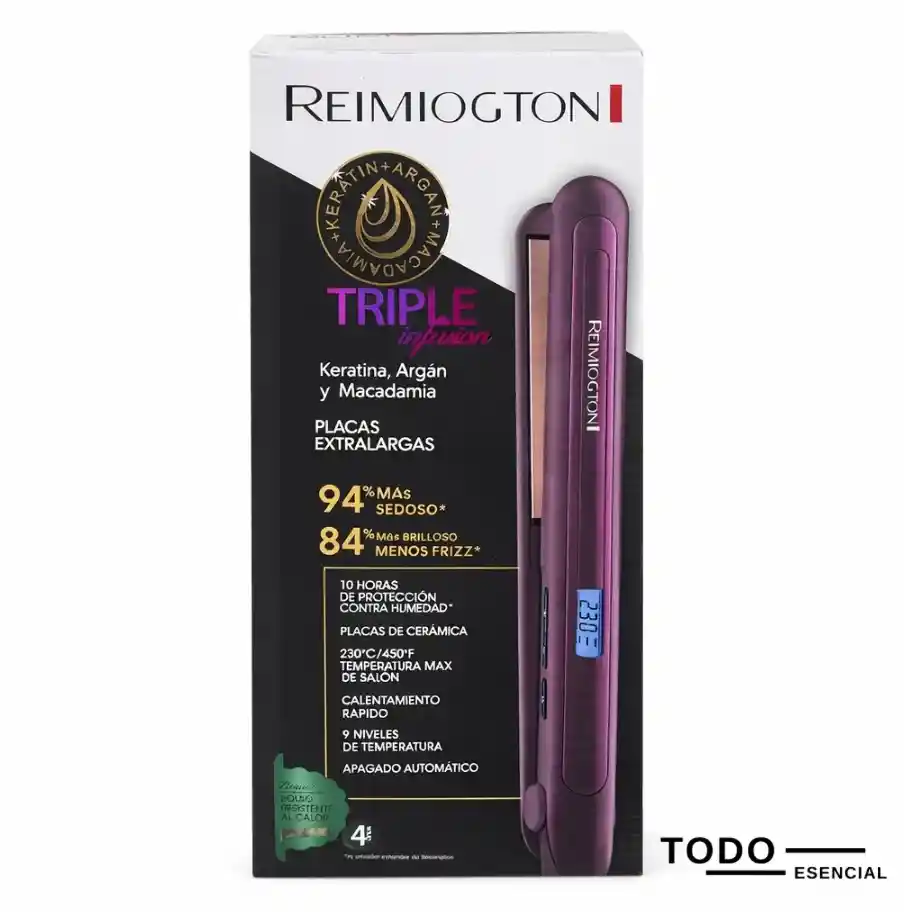 Logra un alisado perfecto, brillante y sin frizz con la Plancha Alisadora Reimiogton Triple Infusion, diseñada para cuidar tu cabello mientras lo estilizas. Gracias a su tecnología con keratina, argán y macadamia, proporciona un acabado suave, sedoso y profesional desde la primera pasada. Sus placas extralargas de cerámica permiten un alisado más rápido y uniforme, mientras su control de temperatura digital te da precisión total según tu tipo de cabello. Ideal para uso diario o resultados de salón desde casa. Características principales 💜 Tecnología Triple Infusión: con keratina, argán y macadamia para mayor cuidado del cabello. 🔥 Temperatura hasta 230°C: alisado profesional en menos tiempo. 🎛️ Control digital: ajusta la temperatura según tu necesidad. 📏 Placas extralargas de cerámica: cubren más cabello en cada pasada. ⚡ Calentamiento rápido: lista para usar en segundos. 🌬️ Anti frizz: reduce el encrespamiento y mejora el brillo. 🔄 Cable giratorio: mayor comodidad al usarla. ⏱️ Apagado automático: seguridad garantizada. ✅ Perfecta para quienes buscan un cabello liso, brillante y protegido con resultados profesionales en casa.