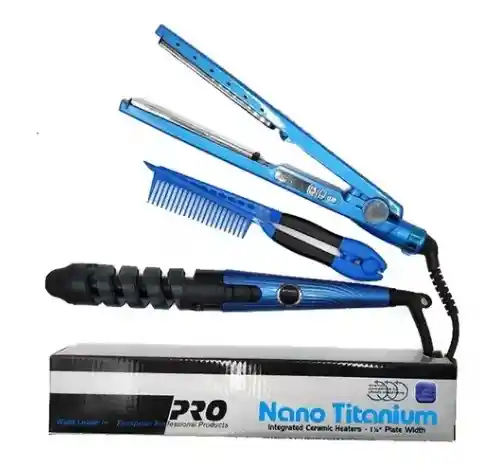 Plancha Nano Titanium Profesional - Plancha de 1 1/4". - Digital Titanium 450° F. - 40% más rápida que una plancha normal. - Temperatura graduable. - Indicador luminoso. - Cable giratorio. - No daña el cabello. Rizador Profesional - Temperatura regulable: 170 °C. - Tipo de indicador: Interruptor ON-OFF, Piloto. - Encendido/Apagado. - Revestimiento: Cerámica Avanzada. - Guías en espiral para facilitar el rizado. - Longitud del cable: 1,8 mt.