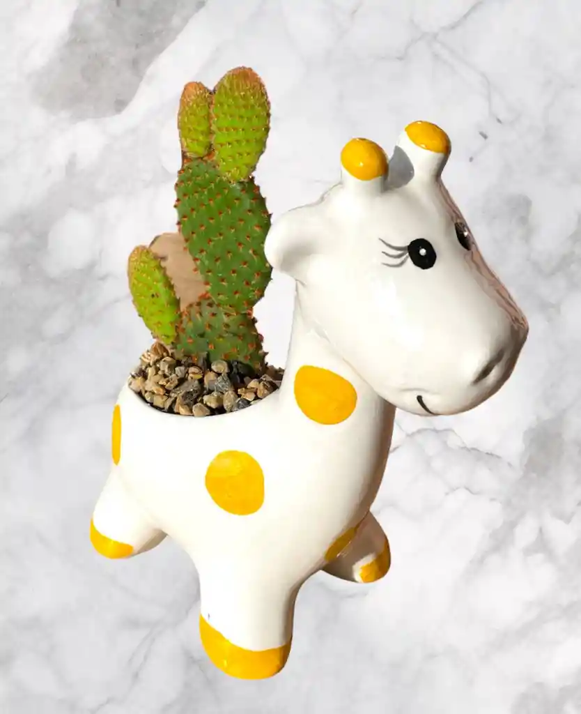 los cactus almacenan el agua en sus tallos, abren sus pequeñas y muy pegadas hojas para que el agua entre a toda la planta, esto lo hacen únicamente durante la noche. Las hojas son tan pequeñas que a veces terminan siendo espinas. Entonces, durante el día no pierden agua. Ademas viene acompañada de una hermosa matera en ceramica con diseño de jirafa que hara resaltar la belleza de la planta