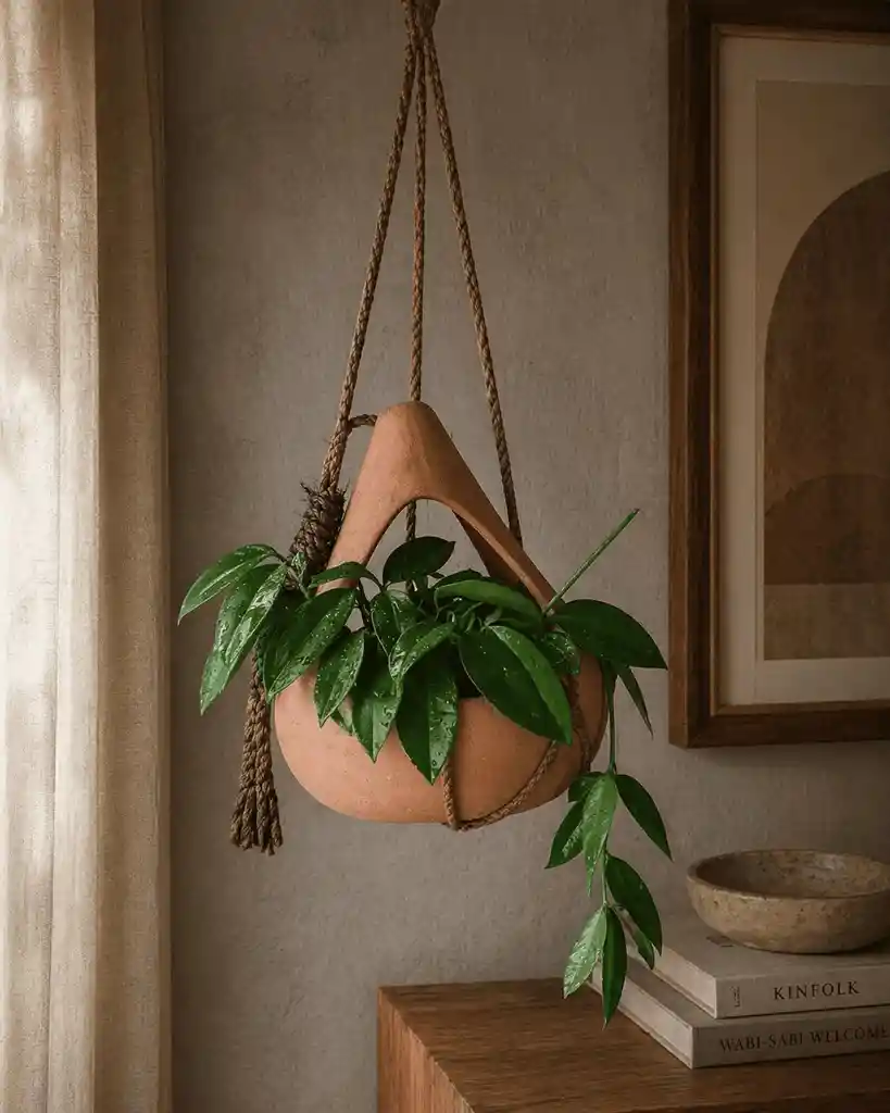 Hermosa planta colgante presentada en una maceta de barro de diseño orgánico, acompañada de un soporte en macramé que aporta un estilo bohemio y natural a cualquier espacio. Ideal para decorar interiores con un toque cálido y moderno, perfecta para ubicar cerca de ventanas, salas, habitaciones o espacios de descanso. Sus hojas verdes y colgantes crean un ambiente fresco y relajante. Cada planta es única, por lo que la variedad puede variar ligeramente. Requiere luz indirecta y riego moderado.