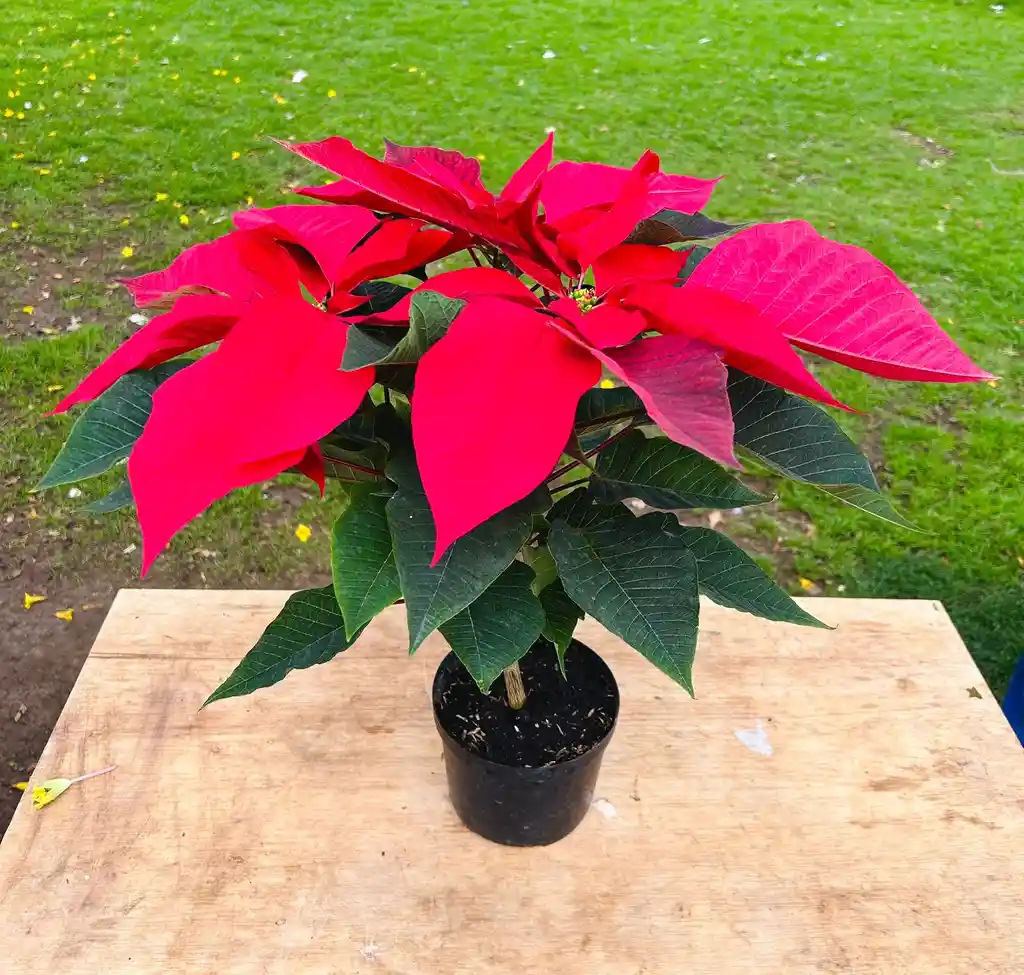 Hermosa Planta de navidad natural, de color rojo. incluye matera plastica negra . altura promedio de 30 a 55 cm. Mata de interio , poca luz, agua cada 3 días.