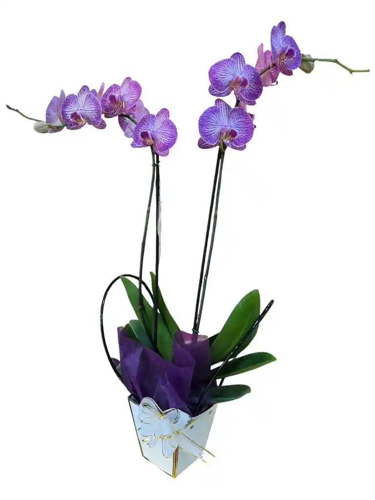 Planta de orquídea phalenopsis de dos varitas color violeta Moño en satín blanco Caja de cartón tradicional en forma de bolsito blanca