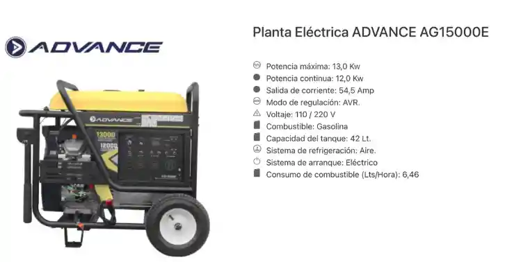 La Planta Eléctrica Advance AG15000E es la solución ideal para quienes buscan potencia y confiabilidad en un equipo de generación eléctrica. Con una potencia máxima de 13,000 W, este generador monofásico es perfecto para abastecer tus necesidades energéticas en situaciones de emergencia o en actividades al aire libre. Su tecnología AVR garantiza una salida de voltaje estable, protegiendo tus dispositivos electrónicos de posibles sobrecargas. Diseñada para funcionar con gasolina, la Advance AG15000E ofrece un arranque eléctrico que facilita su uso en cualquier momento. Con un voltaje de corriente alterna de 110V/220V, es versátil y se adapta a diferentes requerimientos eléctricos. Su eficiencia energética clasificada como A asegura un consumo optimizado, permitiéndote disfrutar de un rendimiento superior sin comprometer el consumo. Este generador es ideal para hogares, obras de construcción o eventos al aire libre, donde la disponibilidad de energía es crucial. La Advance AG15000E combina robustez y facilidad de uso, convirtiéndola en una opción confiable para quienes necesitan energía en cualquier circunstancia. Asegúrate de tener siempre a mano la potencia que necesitas con esta planta eléctrica de alto rendimiento. SOMOS IMPORTADORES DIRECTOS ENVIOS A TODO EL PAIS