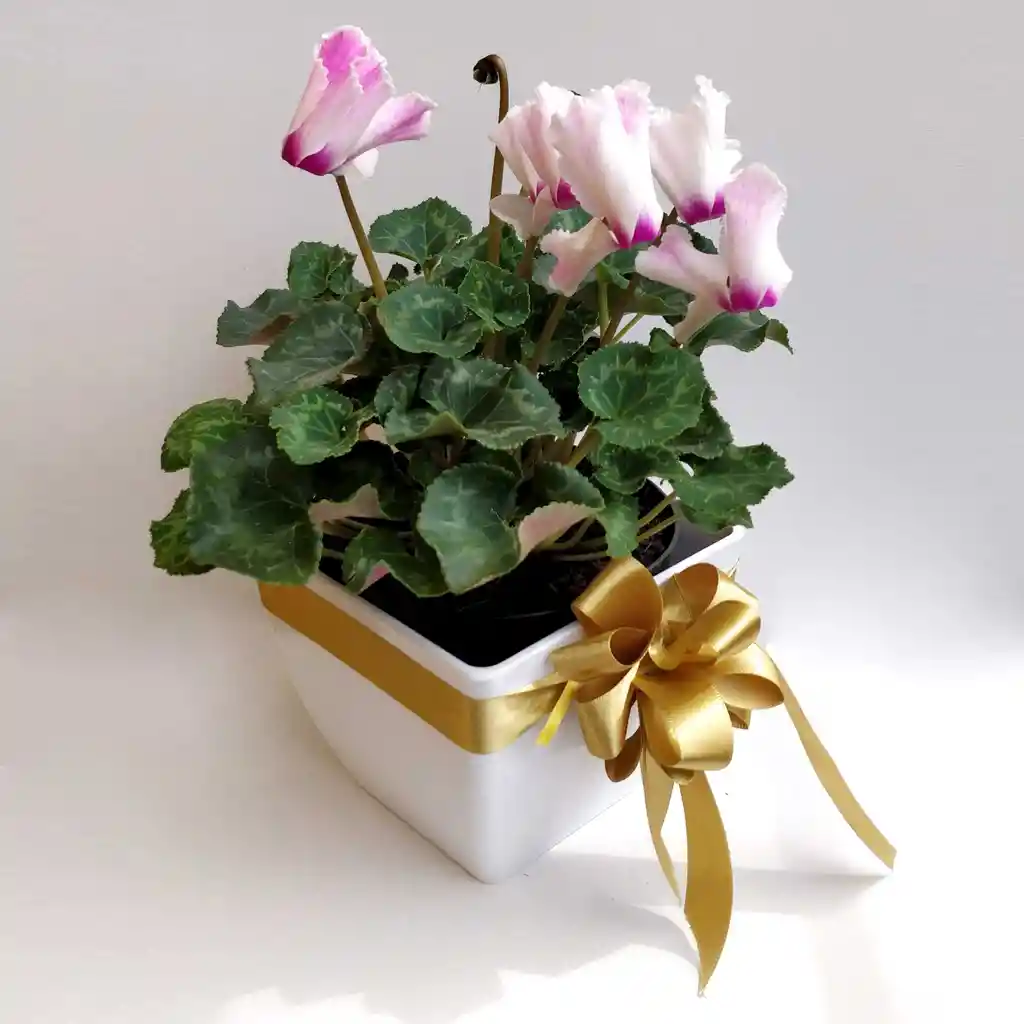 Planta con floración que dura todo el año, se puede tener en espacios interiores o a la sombra afuera viene con matera en melamina y moño dorado en tela