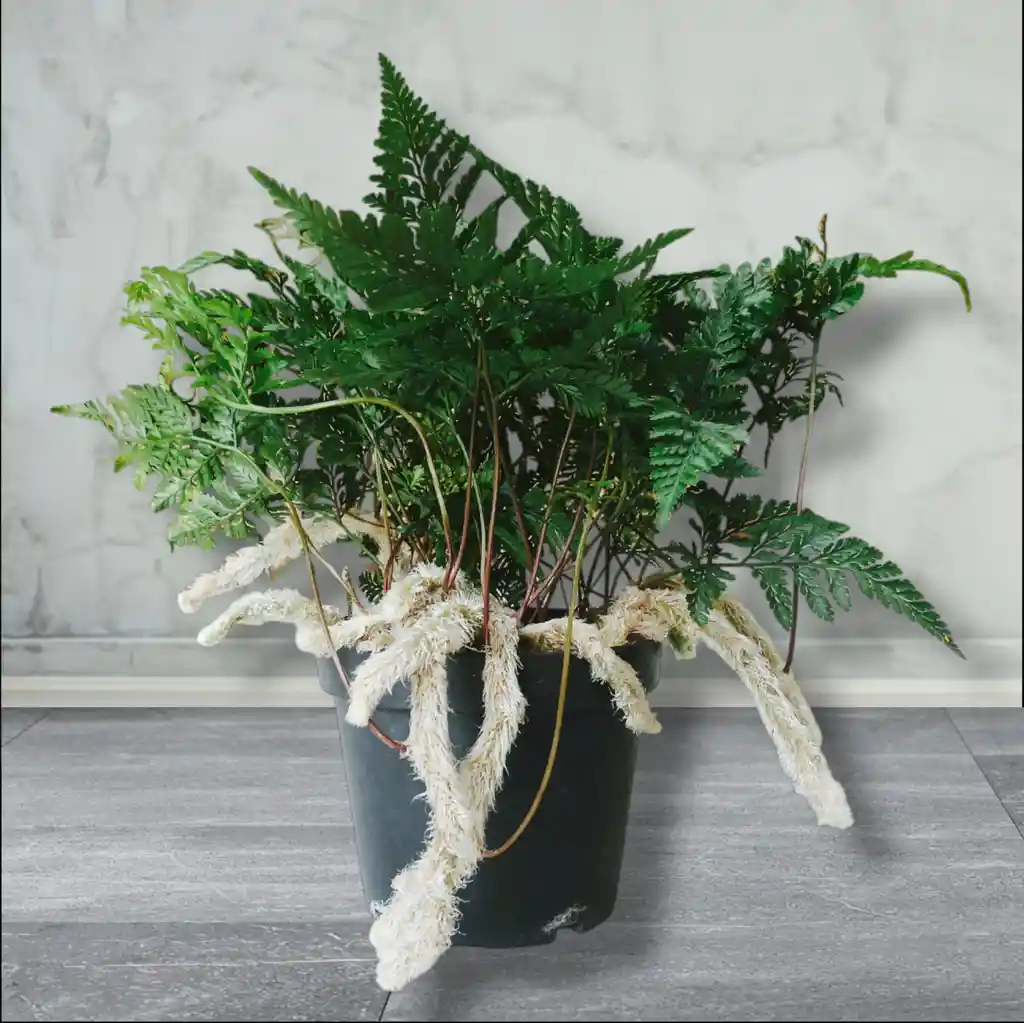 El helecho pata de conejo es un helecho de tamaño mediano y porte rastrero, muy utilizado como planta de interior en maceta o cesta para colgar. Su nombre común se lo confieren unos rizomas peludos que cuelgan sobre el borde de la planta, que se asemejan a la pata de conejo. Sus hojas de forma triangular son de color verde intenso. Es una planta de interior en lugar húmedo y luminoso. También puede situarse en exterior en semisombra o sombra, donde no reciba sol directo y disponga de suficiente humedad. Esta planta es unica y diferente con sus diferentes caractersitcas que hacen de este una planta hermosa, perfecta para decorar cualquier espacio, ademas de esto es el regalo perfecto para cualquier ocasion.