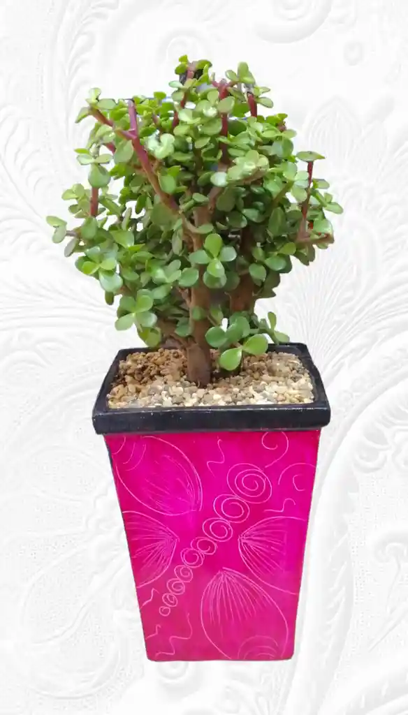 es una planta perenne, con ramas gruesas y hojas carnosas de 3 a 7 cm, que crecen en pares opuestos a lo largo del tallo. Es originaria de África del sur, crece en los laterales de las montañas en lugares rocosos y calurosos con lluvias invernales, ademas esta viene acompañada de una hermosa matera de barro pintada que hace resaltar su belleza.