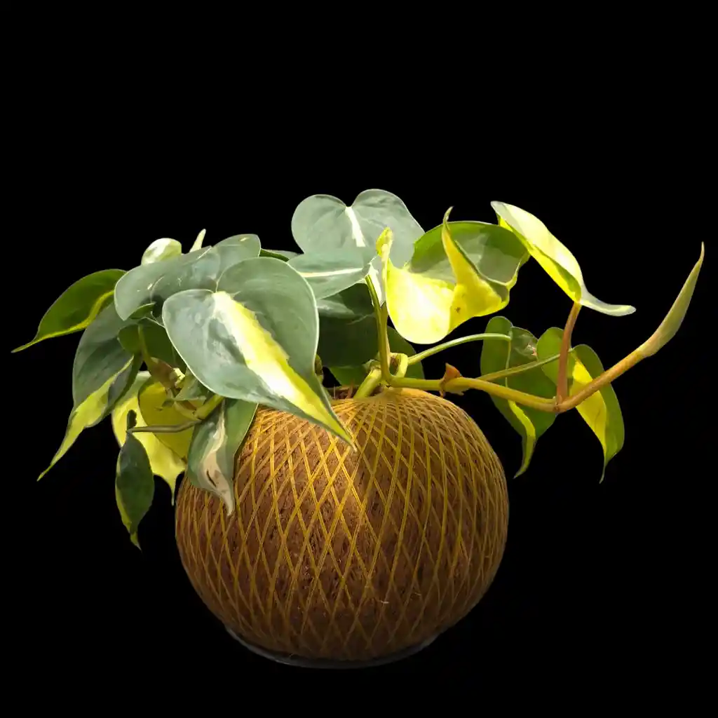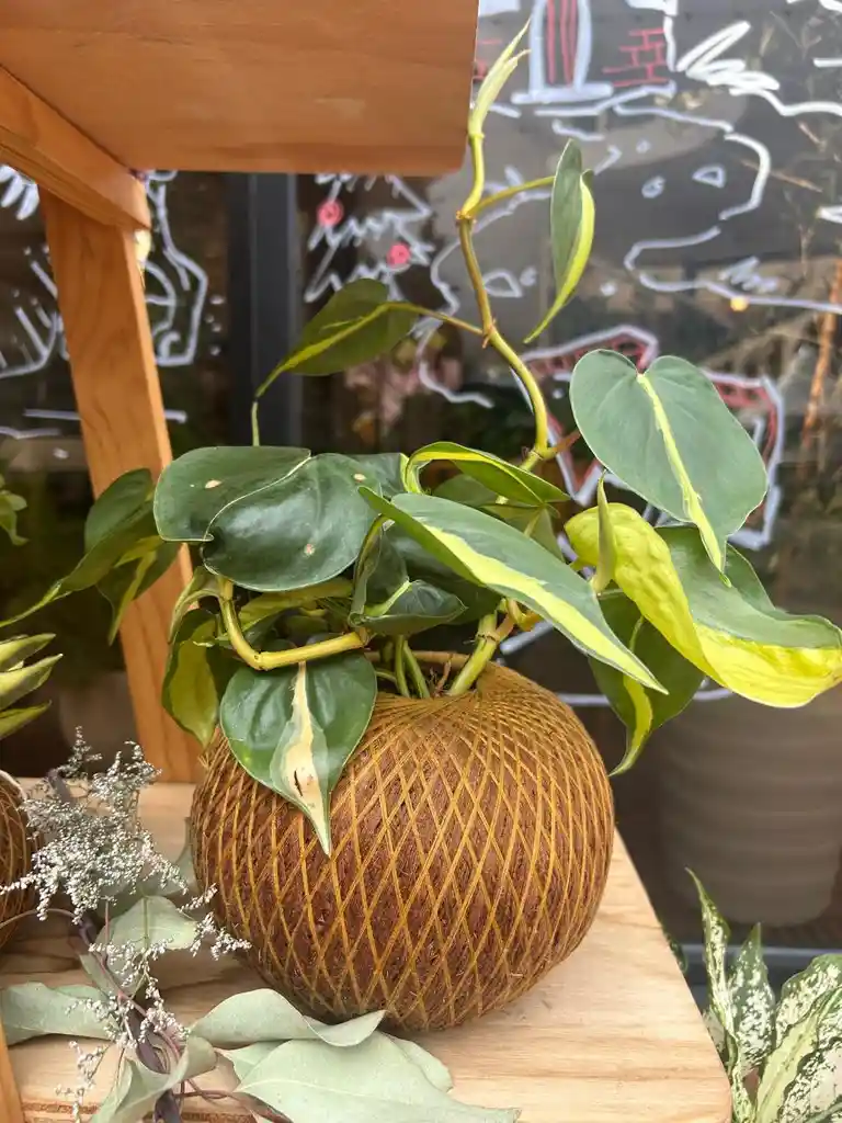 El Kokedama es una forma de bonsai que simboliza la conexión entre el cielo y la tierra, es una forma de expresar el equilibrio entre el ser humano y la naturaleza y el respeto por la vida. El Filodendro rayo de luna es una planta de interior colgante perfecta para decorar estantes.