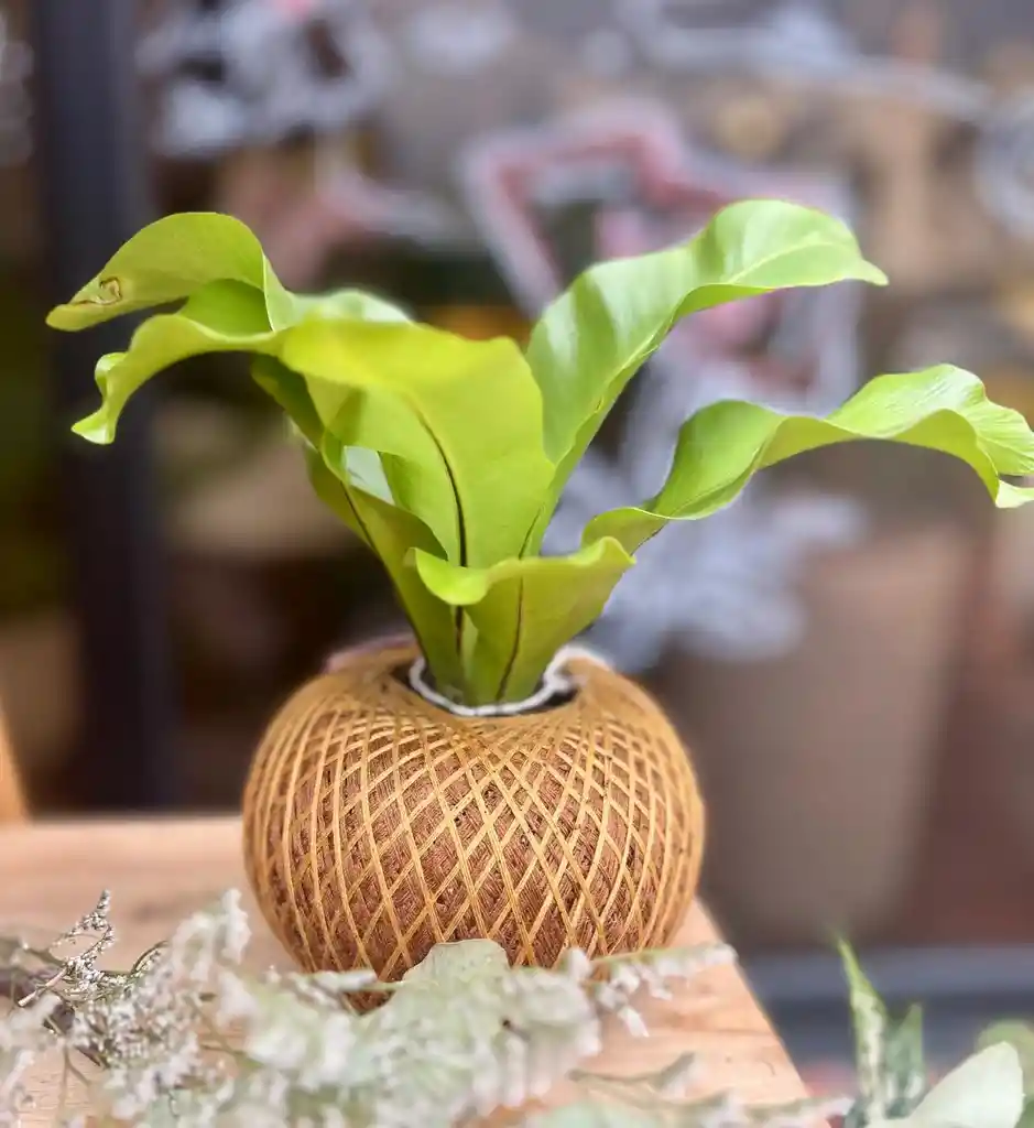El Kokedama es una forma de bonsai que simboliza la conexión entre el cielo y la tierra, es una forma de expresar el equilibrio entre el ser humano y la naturaleza y el respeto por la vida. El helecho nido es una planta de fácil cuidado, le gusta la humedad ambiental, no le gusta el sol directo, es perfecta para tus espacio interiores.