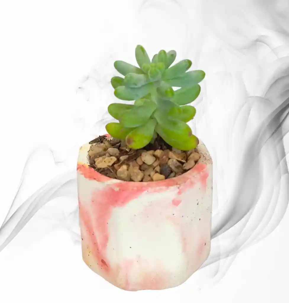 las sucuelentas son plantas perfectas para decorara tu hogar o cualquier espacio ya que se considera que es aquella que atrae y genera abundancia, ademas de tener una apariencia hermosa esta cuenta con una forma que la hace parecer una flor, acompañada de una mantera redonda en ceramica de tonos blanco, naranja y azul.