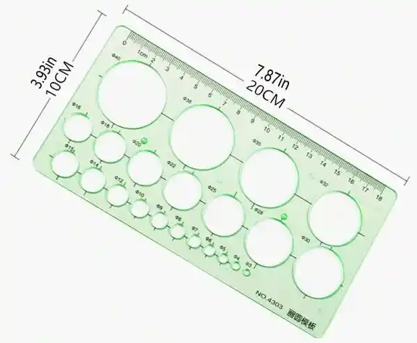 Características Principales Material y Diseño: Generalmente están fabricadas en plástico flexible o rígido, a menudo de color transparente (verde o humo) para permitir ver el dibujo debajo. Variedad de Medidas: Contienen múltiples perforaciones circulares de diferentes diámetros, habitualmente marcados en milímetros. Pueden incluir desde círculos muy pequeños (1 mm) hasta tamaños medianos (aproximadamente 35 mm). Marcas de Eje: Cada círculo suele tener cuatro pequeñas marcas o muescas que corresponden a los ejes verticales y horizontales (cuadrantes). Estas guías son fundamentales para alinear el círculo con precisión sobre el dibujo. Bordes Biselados: Muchos modelos cuentan con bordes internos inclinados para facilitar el uso con portaminas o estilógrafos, evitando que la tinta se corra.
