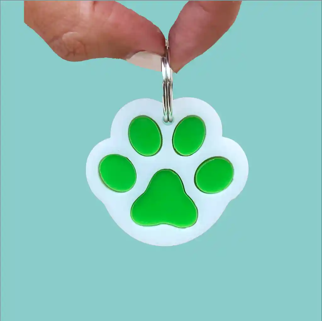 Placa de identificación en acrílico en forma de huella. Nombre de tu mascota y 1 o 2 teléfonos de contacto grabados en la parte de atrás. Resistentes a golpes y al agua.