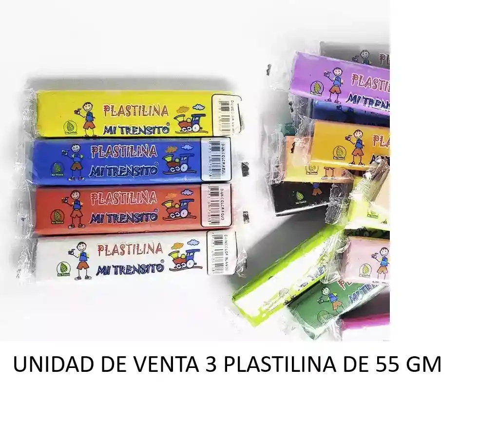 PLASTILINA EN BARRA DE 55 GM CADA UNA X 3 UNIDADES MARCA MI TRENSITO COLORES SURTIDOS. Los colores se envían surtidos y varían de acuerdo a la disponibilidad. EAN 7707326070054. UNIDAD DE VENTA 3 PLASTILINA DE 55 G