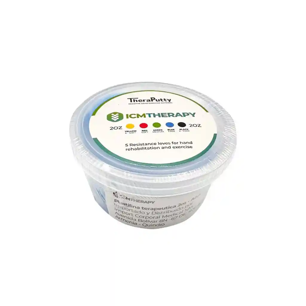 Plastilina Terapéutica 2 oz ICM Therapy — Fortalecimiento y Rehabilitación de Manos Plastilina terapéutica diseñada para mejorar la fuerza, movilidad y coordinación de manos y dedos de forma progresiva y segura. Ideal para fisioterapia, rehabilitación funcional, recuperación post lesión y entrenamiento de destreza manual. Cada color representa un nivel específico de resistencia, permitiendo avanzar gradualmente según la capacidad del usuario: 🟡 Amarillo — Súper Suave: etapa inicial de rehabilitación y movilidad básica. 🔴 Rojo — Suave: fortalecimiento ligero y control muscular. 🟢 Verde — Medio: trabajo de fuerza moderada y resistencia funcional. 🔵 Azul — Fuerte: fortalecimiento avanzado de mano y antebrazo. ⚫ Negro — Súper Fuerte: máxima resistencia para entrenamiento intensivo. ✔ Fortalece manos, dedos y antebrazo ✔ Mejora movilidad, coordinación y agarre ✔ Resistencia progresiva según color ✔ Textura moldeable, cómoda y reutilizable ✔ Ideal para uso terapéutico o domiciliario ✔ Presentación práctica de 2 oz Producto distribuido por FisioAccesorios, proveedor de equipos médicos, hospitalarios y ortopédicos.