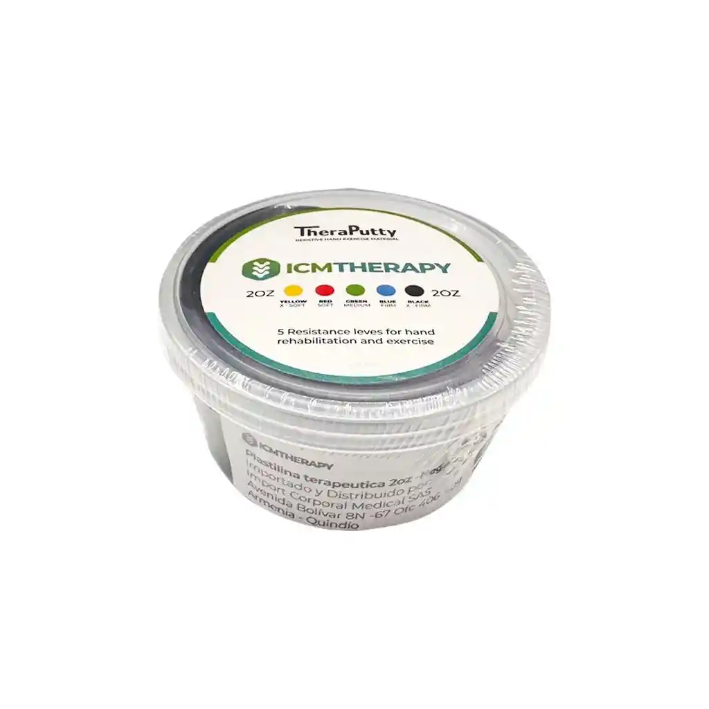 Plastilina Terapéutica 2 oz ICM Therapy — Fortalecimiento y Rehabilitación de Manos Plastilina terapéutica diseñada para mejorar la fuerza, movilidad y coordinación de manos y dedos de forma progresiva y segura. Ideal para fisioterapia, rehabilitación funcional, recuperación post lesión y entrenamiento de destreza manual. Cada color representa un nivel específico de resistencia, permitiendo avanzar gradualmente según la capacidad del usuario: 🟡 Amarillo — Súper Suave: etapa inicial de rehabilitación y movilidad básica. 🔴 Rojo — Suave: fortalecimiento ligero y control muscular. 🟢 Verde — Medio: trabajo de fuerza moderada y resistencia funcional. 🔵 Azul — Fuerte: fortalecimiento avanzado de mano y antebrazo. ⚫ Negro — Súper Fuerte: máxima resistencia para entrenamiento intensivo. ✔ Fortalece manos, dedos y antebrazo ✔ Mejora movilidad, coordinación y agarre ✔ Resistencia progresiva según color ✔ Textura moldeable, cómoda y reutilizable ✔ Ideal para uso terapéutico o domiciliario ✔ Presentación práctica de 2 oz Producto distribuido por FisioAccesorios, proveedor de equipos médicos, hospitalarios y ortopédicos.