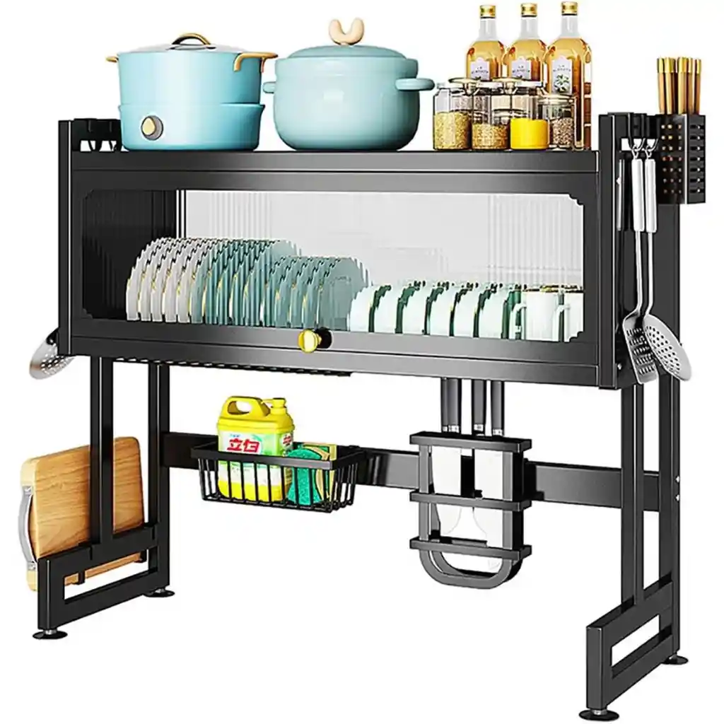 Somos TELEPRODUCTOS BOGOTA Productos 100% garantizados, años de experiencia en ventas online.! -Cuando realices la compra recibirás toda la información de contacto y datos para que puedas hacer seguimiento a tu producto.! ------------------------------------------------------------------------------------------------------------------------------------- Diseño robusto nuestro excelente escurridor para secar sobre el fregadero está hecho de acero inoxidable de grado superior y tiene un elegante revestimiento negro. Fue creado específicamente para el uso sobre el fregadero. Esto le da una capacidad inigualable para soportar cargas y resistencia a la humedad lo que le permite tolerar la humedad que se encuentra en la encimera del fregadero de la cocina. A prueba de polvo La primera capa de este escurridor de platos encierra completamente la segunda capa evitando que el polvo se pegue a los platos y utensilios de cocina. Una puerta transparente con rayas cóncavas convexas también actúa como una barrera adicional contra la acumulación de polvo. Escurridor de platos todo en uno numerosos elementos incluyendo una cesta de almacenamiento un estante para cuchillos un estante para tablas de cortar un soporte para utensilios y seis ganchos están incluidos en este escurridor de platos. Excepto los ganchos de plástico todos los demás componentes están hechos de acero inoxidable de alta calidad. Además te damos una llave hexagonal y una llave pequeña para una instalación sencilla sin necesidad de herramientas adicionales. Estabilidad mejorada cuatro ventosas en los pies del escurridor de platos y dos varillas de soporte en cada pata del escurridor sobre el fregadero garantizan que se mantenga firmemente en posición vertical y no se vuelque.