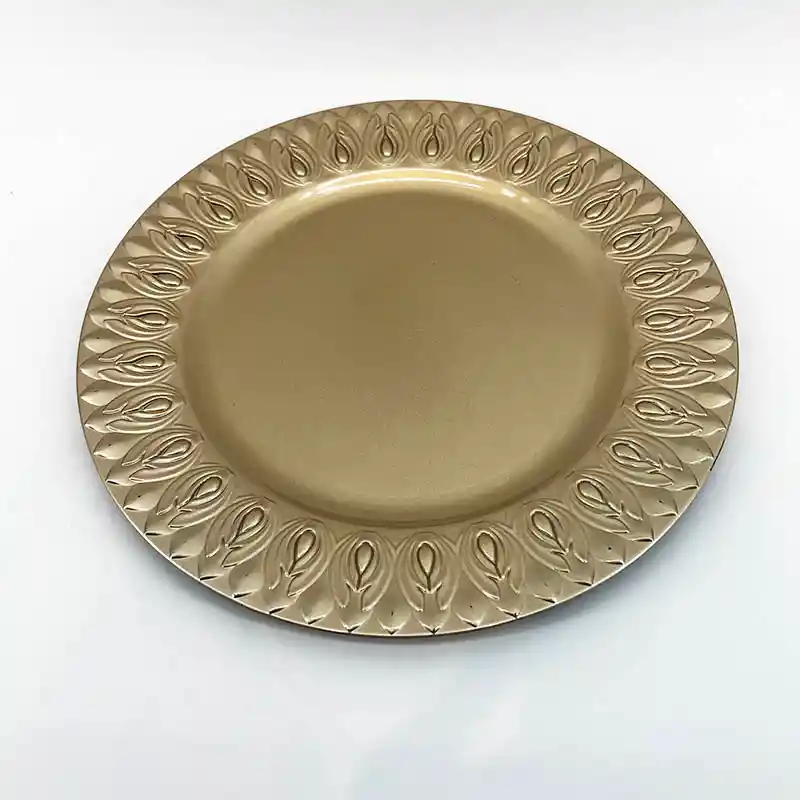 PLATO BASE CON MEDIDAS DE 32.8X32.8X1.5CM. SU DISEÑO TIENE BORDE DE TULIPANES EN COLOR CHAMPAÑA. SU MATERIAL ES PLASTICO PVC.