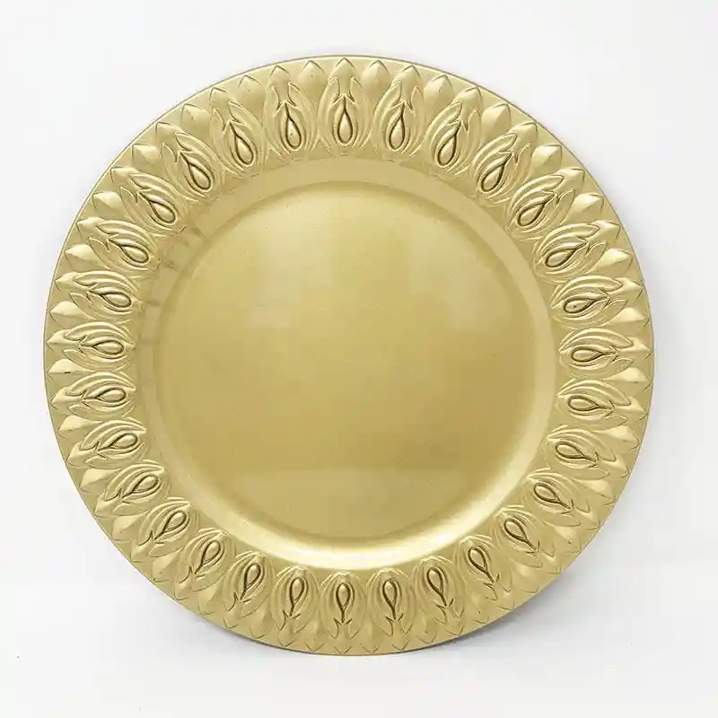 PLATO BASE CON MEDIDAS DE 32.8X32.8X1.5CM. TIENE DISEÑO DE BORDE CON FIGURA DE TULIPANES EN BOTON DORADO. SU MATERIAL ES PLASTICO PVC.