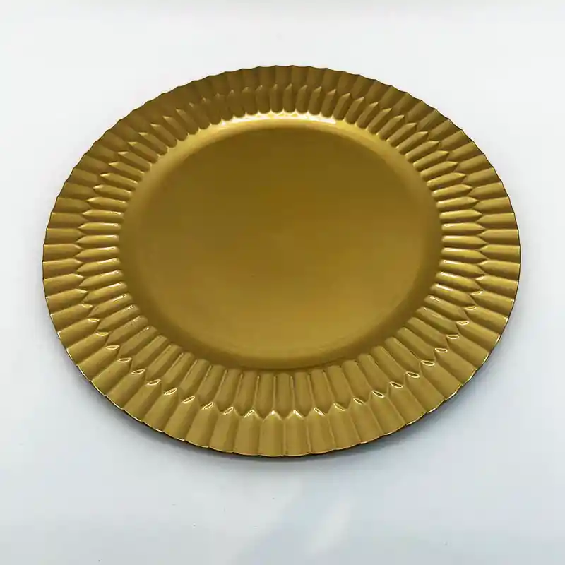PLATO BASE CON MEDIDA DE 33CM. TIENE DISEÑO DE DOBLE LINEA EN EL BORDE DE COLOR DORADO. SU MATERIAL ES PLASTICO PVC.