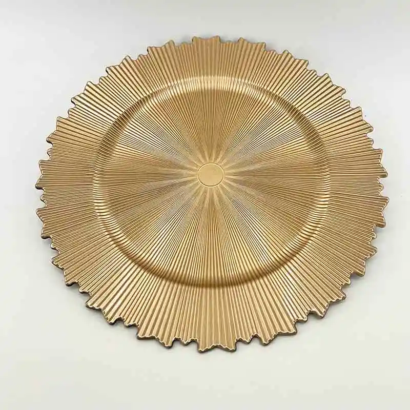 PLATO BASE CON MEDIDA DE 33CM. ES DE COLOR CHAMPANA, TIENE DISEÑO DE RAYAS Y SU BORDE ES IRREGULAR, SU MATERIAL ES PLASTICO PVC.