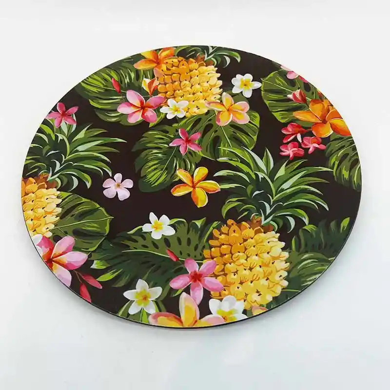 PLATO BASE CON MEDIDAS DE 33CM. TIENE DISEÑO DE PIÑAS, HOJAS VERDES ESTILO PHILODENDRUM Y FLORES ROSADAS CON BLANCO. SU MATERIAL ES PLASTICO PVC.