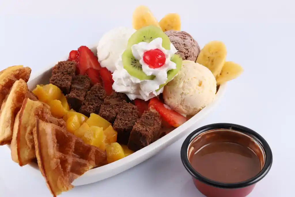 Tres sabores de helado acompañados de durazno, fresas, kiwi, banano, waffle, brownie, chantilly, salsa de chocolate o arequipe.