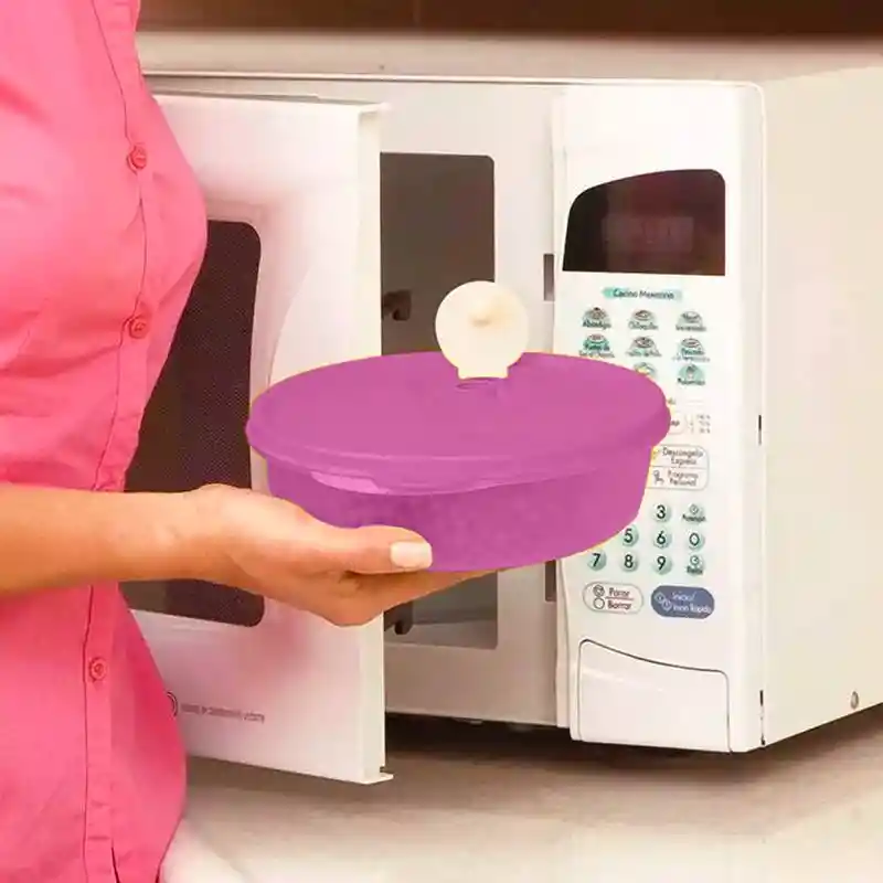 De la línea de Microondas este contenedor ideal para que guardes y lleves tus alimentos, elaborado en plástico atóxico resistente a cambios de temperatura, por lo cual es posible conservar la comida en el refrigerador y luego calentarla de forma segura en el horno microondas, cuenta con un sello hermético o tapa que tiene una válvula de escape de vapor, No tiene empaque de silicona alrededor del sello que permita la acumulación de bacterias. Para llevar al horno microondas destapa, superpone el sello encima del recipiente, levanta la válvula y calienta. Enjuagar siempre con agua fría después de su uso, para evitar la acumulación de olores fuertes o manchas. Medidas: 560 ml capacidad total 600ml - Ø 16 x 5.7 cm de alto. Producto plástico libre de BPA