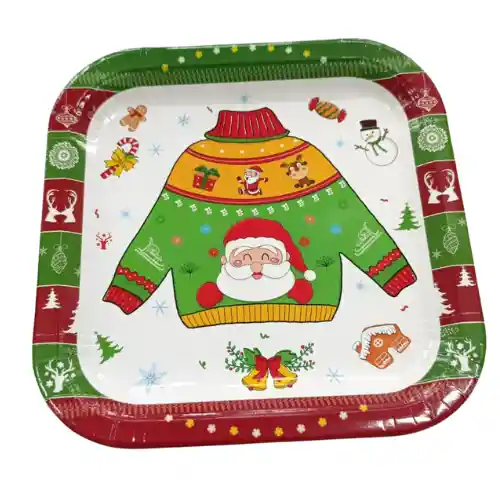 PLATO CARTON CUADRADO 23CM ESTAMPADO NAVIDEÑO BUZO PAPA NOEL PAQX10UND