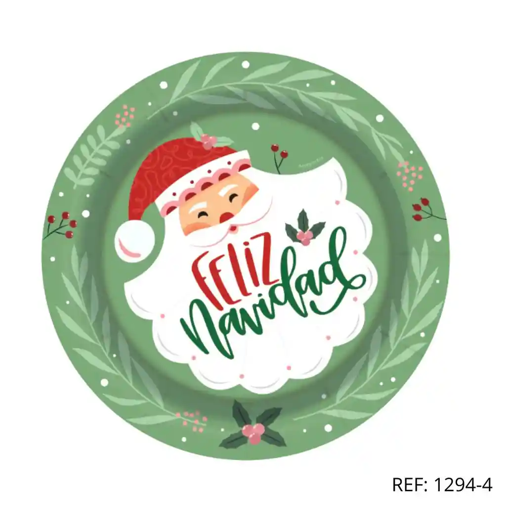 Plato desechable navideño “Santa Feliz”, perfecto para decorar tus fiestas. Material: cartón resistente. Ideal para celebraciones.