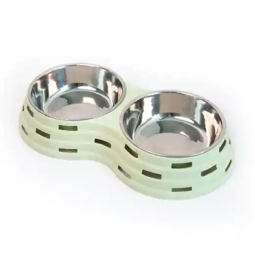 comedero y bebedero doble para mascotas, diseñado con tazones de acero inoxidable removibles y una base de plástico resistente. El diseño de la base, con esas ranuras características, no solo es estético sino que ayuda a que sea ligero y fácil de manipular.