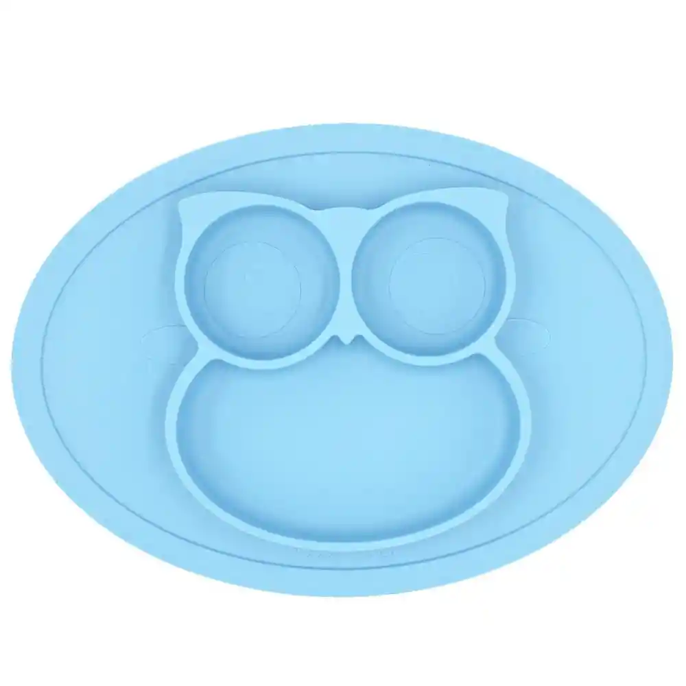 Plato de silicona con diseño de Búho se adhiere a cualquier superficie lisa, tiene 3 compartimientos. Fácil de limpiar Color Azul. Envíos a nivel nacional.
