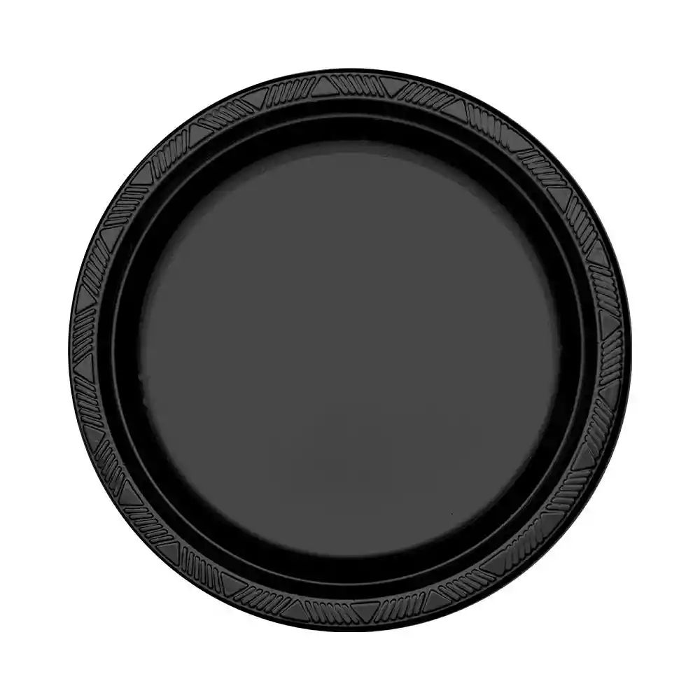 Plato De Plástico Grande 9" Desechable color Negro Paquete de 10 Platos Desechables -Material: Plástico (Cumple con normas americanas para uso de alimentos y bebidas) -Contenido: 10 Platos -Dimensiones: ancho 23cm, altura 2.8cm.