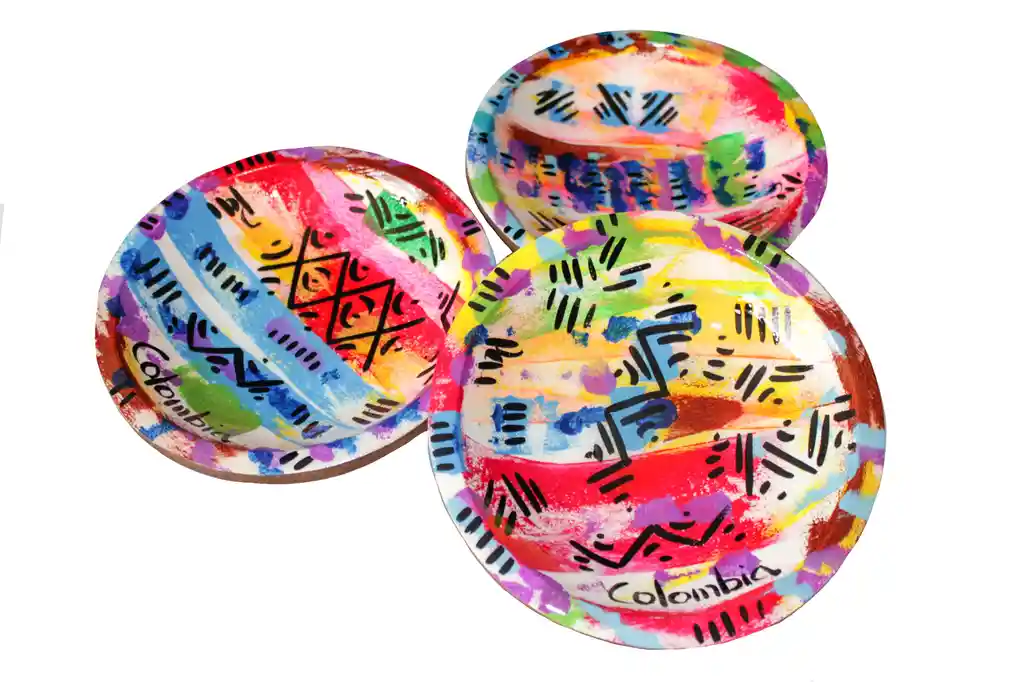 Producto en madera, pintado a mano con diseños originales Colombia y resinado. Son piezas originales por lo tanto los colores y trazos varían