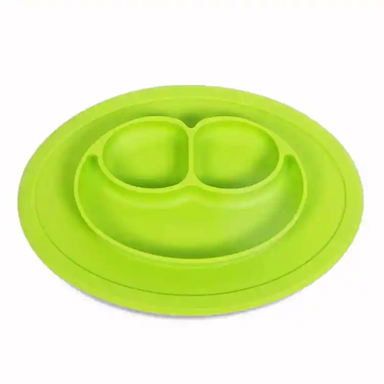 PLATO SILICONA ANTI DESLIZANTE CARITA FELIZ COLOR: VERDE • Silicona de grado alimenticio. • 3 compartimientos. • Evita los derrames de comida. • Fácil de limpiar.• Libre de BPA.• Medidas 27 x 20 cms. • Recomendado 6 meses +.