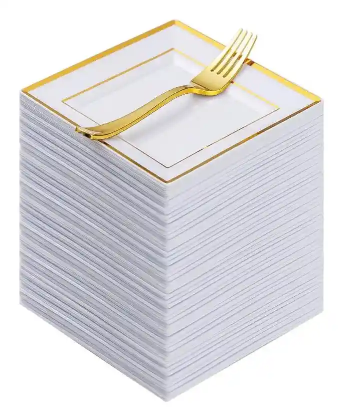PLATOS DE PLÁSTICO BLANCOS BORDE DORADO TAMAÑO 18 CMS PAQUETE X 6 UNDS NO CONTIENE TENEDORES IDEAL PARA POSTRES, TORTAS, FLAN ETC MATERIAL RESISTENTE DE PLÁSTICO DURO ES POSBLE REUTILIZARLOS