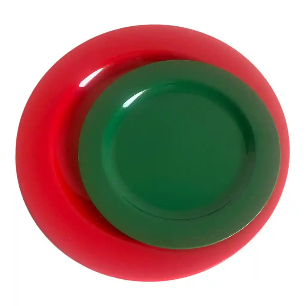 SET DE 12 PLATOS DUROS , ELABORADOS EN PLÁSTICO LIBRE DE BPA 6 UNDS DE PLATOS 26 CMS ROJOS Y 6 UNDS DE PLATO 18 CMS VERDES MUY RESISTENTES ES POSIBLE REUTILIZARLOS