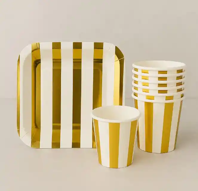 Kit de Platos y Vasos perfectos para una celebración muy elegante- Rayas doradas 10 platos de 18 cm de diámetro blanco con plateado para Pastel 10 vamos 10 onz Blanco y dorado disponibilidad inmediata