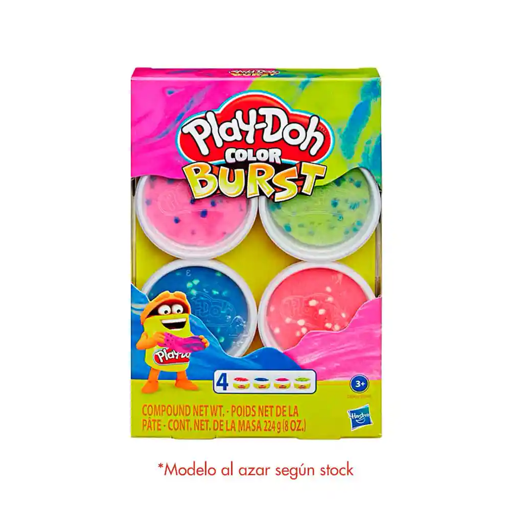 Contiene 4 Unidades de 56 g c/u. ¡Diviértete a Todo Color con Play-Doh Color Burst!. Es la Clásica Masa Play-Doh Que Conoces y Que Tanto te Gusta, Pero con Una Innovadora Manera de Jugar y Mezclar. Mira Cómo Los Fragmentos de Color de la Masa se Fusionan y Cambian al Jugar con Ella. Usa el Rodillo o Las Manos Para Estrujar y Mezclar Los Dos Colores Para Crear un Efecto Marmolado. ¡Mezclar Los Colores es Una Experiencia Tan Agradable!. Este Set Incluye Cuatro Latas de 56 G de Distintos Colores. Los Niños y Niñas Que Adoran Hacer Manualidades con Plastilina Desbordarán de Creatividad al Poder Crear Planetas y Mucho Más. Recomendado Para Niños de 3 Años en Adelante, Este Set es Ideal Para Complementar un Regalo. Hasbro, Play-Doh y Todas Las Propiedades Relacionadas Son Marcas Registradas de Hasbro.