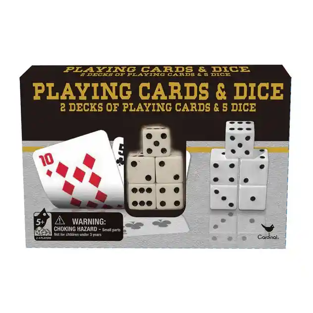 ¡Pon a prueba tu suerte con el juego Classic Games Playing Cards And Dice! ¡Es hora de un nuevo tipo de diversión familiar cuando rompes el mazo y lanzas los dados! Desafía a tus oponentes y lleva la puntuación con este práctico y versátil paquete. Incluye 2 mazos de cartas y 5 dados.