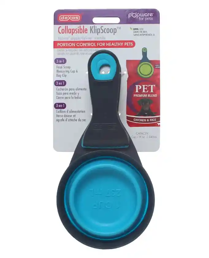 Esta herramienta tres en uno es: una taza medidora, cuchara de alimentos y clip de bolsa todo en uno Talla M : 237 ml / 1 Taza / 8oz Color: Azul. Se pliega por completo para servir la cantidad necesaria. Se engancha perfectamente en la bolsa de comida de su perro o gato, sellándola para el próximo uso y siempre a mano para la próxima alimentación Apto para lavavajillas. Libre de BPA